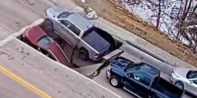 У місті Омаха, штат Небраска, 24 лютого просто посеред перехрестя раптово провалилося дорожнє покриття — у вирву впали одразу два автомобілі, які зупинилися на червоний сигнал світлофора.
