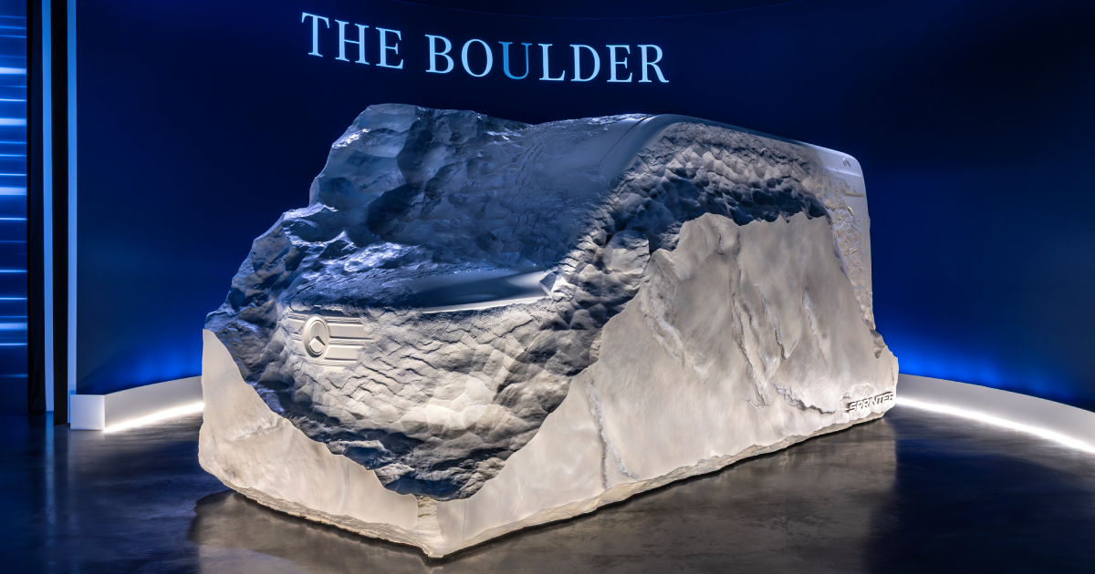 Немецкий автопроизводитель выбрал необычный способ тизернуть дизайн модели Sprinter нового поколения. Вместо привычных затемненных изображений, компания показала дизайн-проект под названием The Boulder.